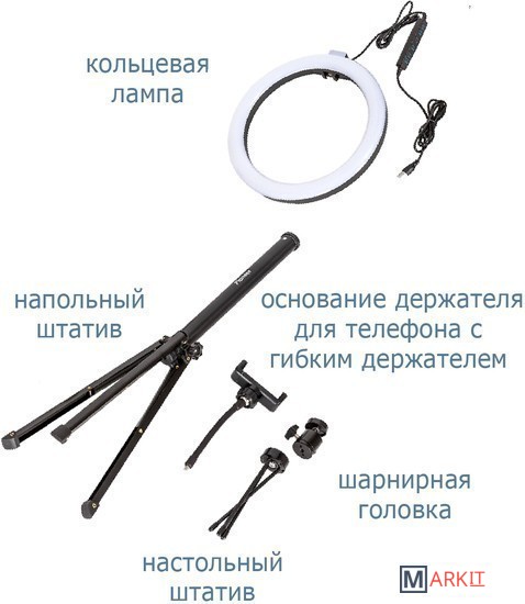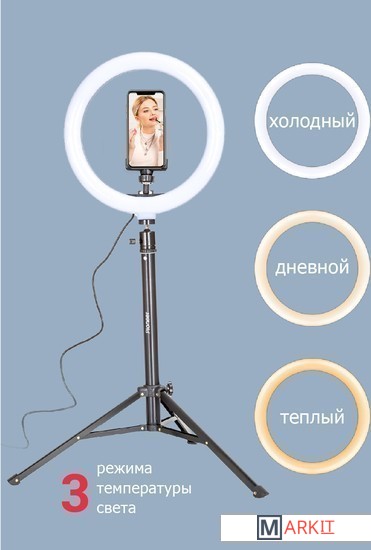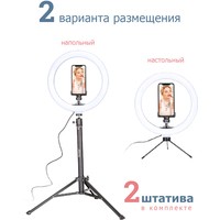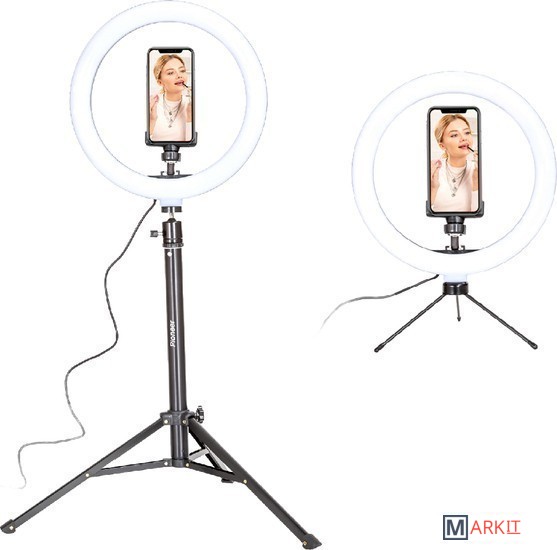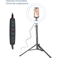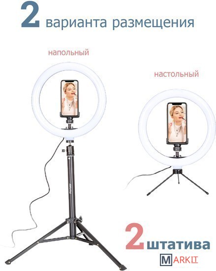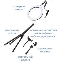 Кольцевая светодиодная лампа Pioneer служит основным или дополнительным источником освещения, равномерно рассеивает свет и призвана скрыть блики, лишние тени и изъяны при при фото- или видеосъемке, потоковой видеотрансляции, при съемке селфи, видео блогов, видеозаписей, или макросъемки и т. д. Осветитель Pioneer поможет добиться правильного, яркого, равномерного освещения при любой съемке.Кольцевая светодиодная лампа Pioneer может использоваться также в качестве источника света для макияжа или маникюра, в качестве настольной лампы, торшера или ночника. Расположение источника света вокруг смартфона помогает добиться правильного, яркого, равномерного освещения при съемке и минимизирует тени.Лампа питается от стандартного порта USB. Ей не требуется встроенной батареи или специализированного адаптера питания. Она будет одинаково хорошо работать с большинством устройств, имеющих порт USB, таких как ноутбук, ПК, пауэрбанк, зарядное устройство USB и т. д.Яркость светодиодного источника света регулируется в широких пределах. Три режима цветовой температуры – теплый белый свет, дневной (естественный) свет и холодный белый свет – позволяют добиться необходимых вам визуальных эффектов и обеспечивают совместимость со светочувствительными материалами с разной спектральной чувствительностью.Гибкий держатель для смартфона и держатель лампы с шарнирной головкой дают свободу в выборе ракурса съемки. Входящий в комплект настольный штатив позволяет устанавливать лампу на столе или других горизонтальных поверхностях.В комплект поставки входит два штатива: настольный и напольный.