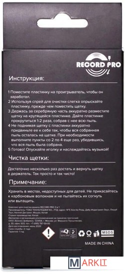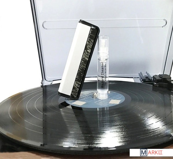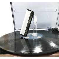 Специальное средство по уходу за виниловыми пластинками с анти-статическим эффектом, мягкая щётка с карбоновым волокном и салфетка из микрофибры, обеспечат 3-х фазный уход за пластинкой легко удалят загрязнения, а также защитят пластинку анти-статическим слоем, препятствующим дальнейшему образованию пыли на поверхности.