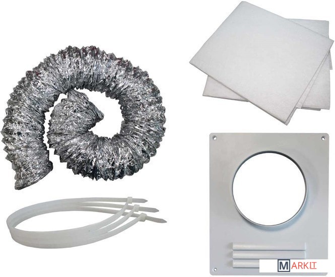 Гибкий воздуховод из многослойной металлизированной плёнки растягивается в длину до 3 м. Вы можете обрезать лишнюю трубу или сложить её гармошкой. Торцевая площадка облегчает подключение к вентиляционному каналу в стене. Два жироулавливающих фильтра защищают двигатель вытяжки от загрязнений, продлевая срок его службы. В наборе есть все крепёжные детали: три нейлоновые стяжки, пластиковые дюбели, стальные саморезы и силиконовые фиксаторы.