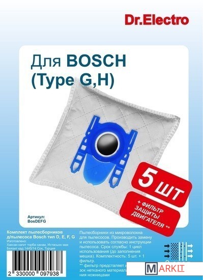 | Комплектация | Мешок для пылесосов Bosch серий D, E, F, G: 5 шт. Фильтр защиты двигателя – 1 шт. |
