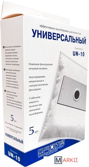 Мешки UN-10 предназначены для уборки пыли классов «L».Пылесборники не боятся воды и острых предметов, прочность на разрыв — до 32 кг, вместимость около 3,5 литра.