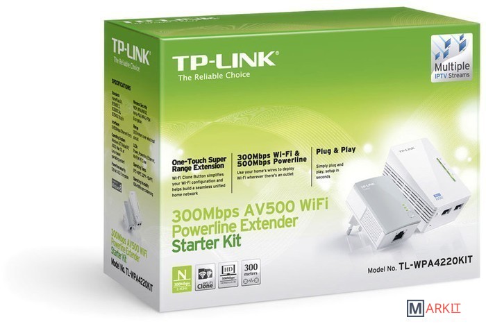 Комплект из двух адаптеров Powerline стандарта AV500 с функцией усилителя беспроводного сигнала до 300 Мбит/с.Особенности:• Кнопка Wi-Fi Clone упростит настройку беспроводной сети и позволит создать надежную единую домашнюю сеть.• Зона покрытия до 300 метров через домашнюю бытовую электросеть• Поддержка протокола IGMP для групповой передачи данных по IP-сетям, оптимизация работы с цифровым телевидением (IPTV).• 128-битное AES-шифрование при нажатии кнопки Pair.