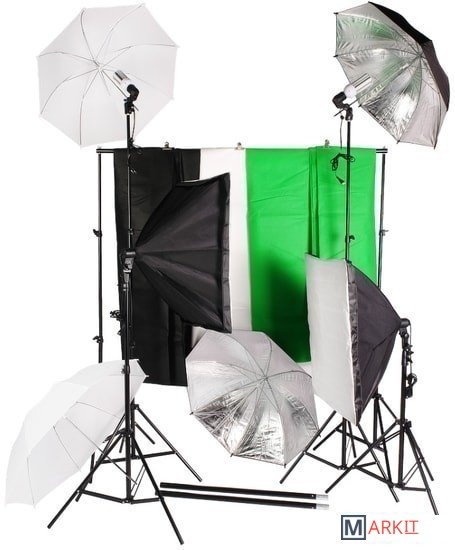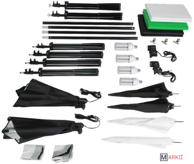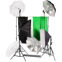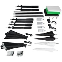 Falcon Eyes KeyLight 425LED SBU KIT – это комплект постоянного света для фото- или видеосъемки, в который входят два патрона LH-E27х1 со складными (несъемными) софтбоксами, два патрона LH-27SU с четырьмя комплектными зонтами (белым рассеивающим и серебристым светоотражающих к каждому патрону), 4 стойки L-2000 высотой 75-200 cм для установки осветителей, 2 стойки L-2000 с перекладиной LSB-425 для крепления комплектных цветных фонов, сумка для хранения и переноски G-006.Комплект подойдет для создания различных световых схем четырьмя осветителями суммарной мощностью 100 Вт в творческой студии или на выезде. Может использоваться для художественной съемки портретов, натюрмортов, предметов, где требуется не только фотографическая точность, но и создание световых акцентов, настроения, тона.С этим комплектом возможно создание и виртуальной студии с использованием технологии «хромакей»: два источника рассеянного света равномерно подсветят экран, состоящий из двух стоек с перекладиной и натянутого комплектного фона. А два других источника света с фотозонтами отделят ведущего или актера от фона при помощи направленного на него (заливающего) светового потока.Студийный осветитель LH-E27х1 с керамическим патроном и светодиодными лампами ML-25 FL LED выдает световой поток (линейный график спектра) с мощностью 25 Вт, цветовой температурой 5500 К и цветопередачей CRI>98. По поверхности лампы вытянутой формы типа Corn равномерно распределены 90 сверхъярких светодиодов, что позволяет полностью заполнить софтбокс светом и получить на выходе из рассеивателя мягкий световой поток без потери мощности.Прямоугольный несъемный cофтбокс размером 50х70 см и глубиной 40 см прикреплен к корпусу осветителя и раскрывается по принципу зонта – достаточно потянуть кольцо вверх от себя. Купол софтбокса изготавливается из специальной ткани с серебристой фактурной светоотражающей внутренней поверхностью и используется как рефлектор. В комплект софтбокса входит тканевый рассеиватель, который надевается на передний край софтбокса и приклеивается на липучки.Осветители LH-27SU также комплектуются мощными светодиодными лампами ML-25 FL LED, их совместное использование со сферическими фотозонтами UR-32 диаметром 75 см позволяет создать управляемый световой поток. В комплекте каждого осветителя имеются рассеивающий зонт, благодаря которому достигается равномерный световой поток за счет освещения на просвет, и светоотражающий зонт с серебристой фактурной поверхностью для более сфокусированного жесткого освещения.Осветители устанавливаются на стойки L-2000 через стандартный шпигот 5/8” с винтовой фиксацией. Положение осветителя можно точно отрегулировать, изменяя высоту стойки от 75 см до 200 см выдвижением алюминиевых трубок телескопических секций диаметром 15/18/22 мм с винтовыми зажимами. Также можно ступенчато менять угол наклона осветителя в пределах от -90° до +90° (ограничивается только габаритами софтбокса).В комплект входят три фотофона: белый, черный и зеленый, который может использоваться для съемки по технологии хромакей. Фоны размером 1.6х3 м изготавливаются из нетканого материала – флизелина. Такие фоны можно равномерно осветить, они устойчивы к износу и загрязнению.Фоны закрепляются на составную перекладину LSB-425 при помощи трех клипс. Длина перекладины, состоящей из четырех секций, соединенных между с