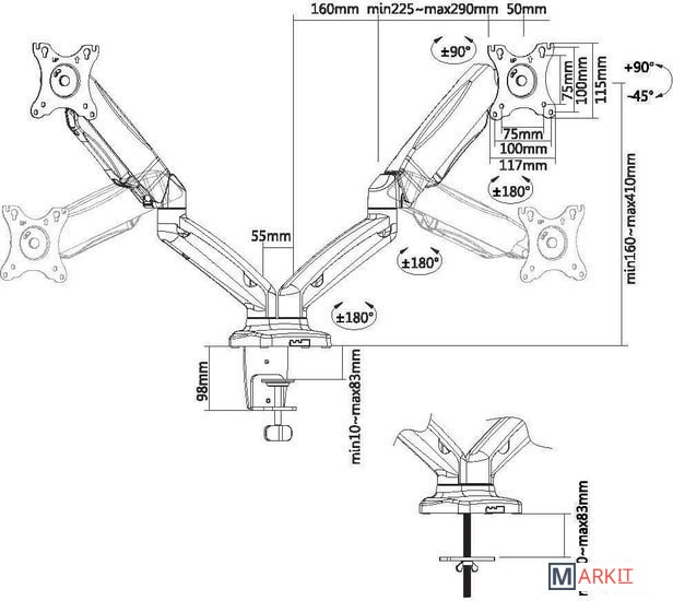| Функциональные особенности | поворотный, с регулировкой высоты, струбцинное крепление, для 2 мониторов / поворотный, с регулировкой высоты, струбцинное крепление |