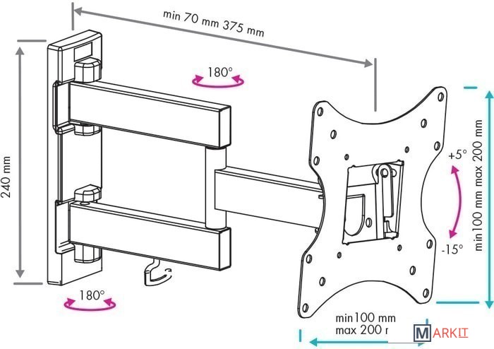 | Угол поворота (без ТВ) | 180 ° |