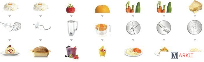 | Функции | блендер, цитрус-пресс, взбивание, смешивание, замешивание дрожжевого теста, терка, шинковка, ломтерезка |
