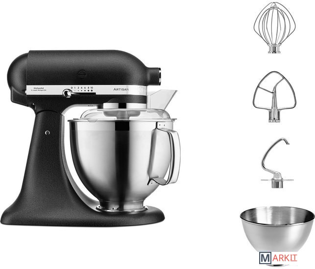 чаша из нержавеющей стали объемом 4,8 л;чаша из нержавеющей стали объемом 3 л;прозрачный защитный обод;венчик;крюк для теста;насадка для смешивания |