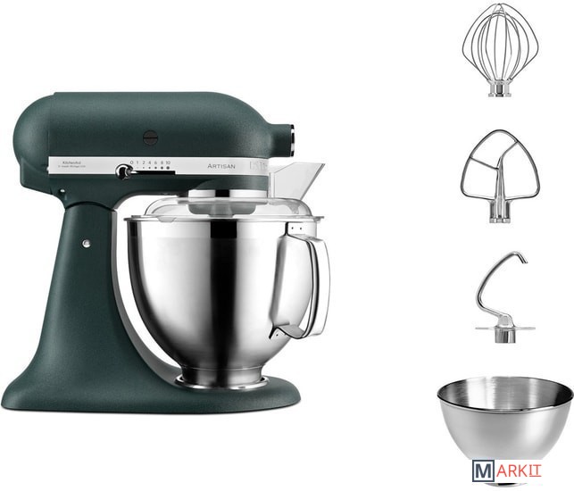 чаша из нержавеющей стали объемом 4,8 л;чаша из нержавеющей стали объемом 3 л;прозрачный защитный обод;венчик;крюк для теста;насадка для смешивания |