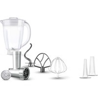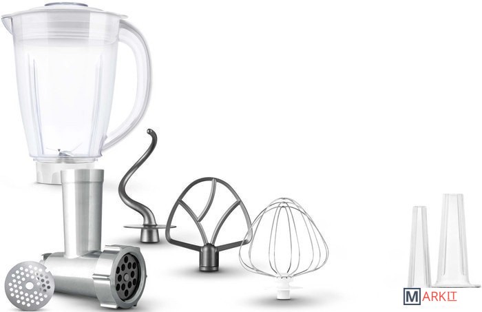 Полная комплектация Мясорубка.Насадки для колбас. Блендер. 3 насадки для миксера: - крюк для замеса, - венчик для взбивания в форме буквы A; - шаровидный венчик для взбивания. Защитная крышка на чашу.