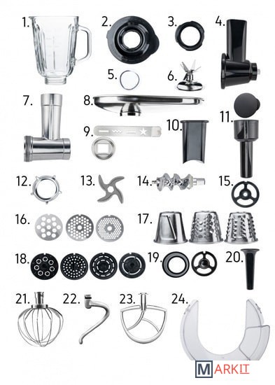 | Функции | мясорубка, блендер, взбивание, смешивание, замешивание дрожжевого теста, терка, шинковка, ломтерезка, драники |