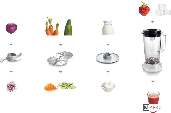 | Функции | блендер, взбивание, смешивание, измельчитель, рубка, терка, шинковка, ломтерезка |
