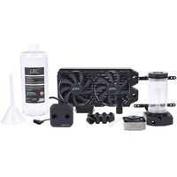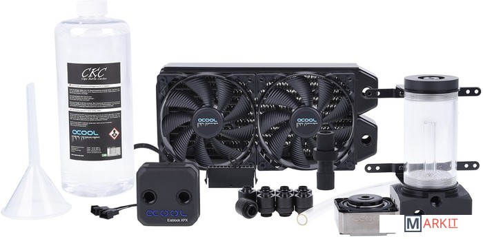 Жидкостное охлаждение с радиаторным блоком для внутреннего или наружного крепления с прозрачным хладагентом.• Радиатор медный NexXxoS XT45 240 мм;• Резервуар Eisbecher DDC 150 mm Aceta;• Помпа Laing DDC 310;• Водоблок Eisblock XPX (Intel/AMD);• Вентиляторы Eiswind Pure Edition 120 мм (2 шт.);• Охлаждающая жидкость прозрачного цвета CKC Cape Kevin Catchher 1000 мл;• Фитинг (8 шт.);• Трубки 13/10 мм (3 м);• Воронка (1 шт.);• Кабели питания;