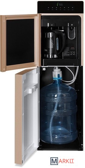 Особенность аппарата, встроенный литровый чайник! Горячая вода нагревается в чайнике,а объем наливаемой воды, регулируется кнопками на передней панели. Разливать горячую воду, так же можно только из чайника! Холодная вода набирается из крана (кран – нажим кружкой). Преимуществом аппарата, является высокая производительность нагрева горячей воды.Панель управления с возможностью отключения нагрева и/или охлаждения воды. Индикация режимов нагрева/охлаждения и отсутствия воды в бутыли. Тихая работа водяного насоса. Защита от протечек. В боковых панелях имеются отверстия под крепления держателей для стаканов.