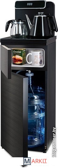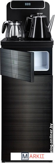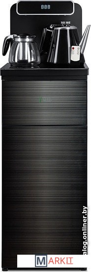 Напольный кулер с чайным столиком. Пульт дистанционного управления. Нижняя загрузка бутыли. Два чайника – для кипячения (изотермический) и заварочный. Без охлаждения, только нагрев. Нагрев воды в чайнике до 100°С. Шкафчик для хранения.Многофункциональный тиабар с пультом дистанционного управления, позволяет управлять аппаратом как на удаленном расстоянии до 7 метров, так и с помощью сенсорной панели управления на русском языке.Функция регулировки температуры воды в чайнике позволяет задавать нужную температуру воды в диапазоне от 40°С до 100°С.Функция регулировки времени подачи воды в чайник – возможность задать время подачи воды в чайник (от 18 до 50 сек).Информационный дисплей в верхней части совмещен с кранами подачи воды. Два чайника, для кипячения и заварочный. Заварочному чайнику можно включить режим постоянного подогрева (~ до 60°С). Чайник кипячения изотермический – меньше греется, лучше сохраняет температуру. Подача воды в него возможна без открытия крышки. Нагрев воды в чайнике включается вручную. Автоотключение нагрева при температуре 100°С.В верхней части корпуса есть шкафчик для хранения продуктов. Корпус черного цвета, передняя панель стеклянная, золотистого цвета. Поверхность чайного столика черная, чайники и кран подачи воды черные с серебристой отделкой.