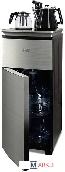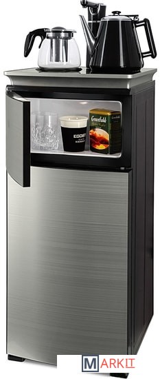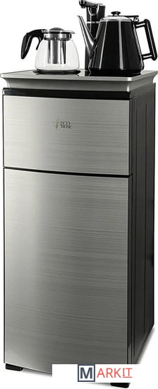 Напольный кулер с чайным столиком. Нижняя загрузка бутыли. Без охлаждения, только нагрев. Нагрев воды в чайнике до 100°С. Два чайника – для кипячения (изотермический) и заварочный. Шкафчик для хранения.Простой, но многофункциональный тиабар:Функция энергосбережения – время работы регулируется от 1 часа до 24 часов.Функция регулировки температуры воды в чайнике позволяет задавать нужную температуру воды в диапазоне от 40°С до 100°С.Функция регулировки времени подачи воды в чайник – возможность задать время подачи воды в чайник (от 18 до 50 сек).На чайном столике расположен кран подачи воды и два чайника, для кипячения и заварочный. Заварочному чайнику можно включить режим постоянного подогрева (~ до 60°С). Чайник кипячения изотермический – меньше греется, лучше сохраняет температуру. Подача воды в него возможна без открытия крышки. Нагрев воды в чайнике включается вручную, либо автоматически в случае использования функции регулировки температуры воды Автоотключение нагрева при температуре 100°С.Панель управления сенсорная, на русском языке, с информационным дисплеем.В верхней части корпуса есть шкафчик для хранения продуктов. Корпус черного цвета, передняя панель – стеклянная, серебристый металлик. Поверхность чайного столика черная с серебристым бортом, чайник для кипячения и кран подачи воды черного цвета с серебристой отделкой.