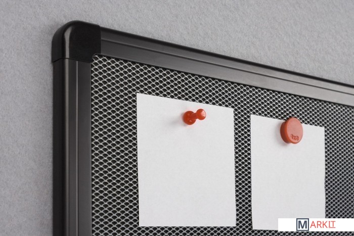 Доска с магнитной поверхностью, с возможностью использования магнитов и игл. Идеальная доска для различных задач. Высокое качество поверхности: фетр и металлическая сетка. Рама изготовлена из алюминия серебристого или черного цвета, с красивыми уголками. Полку можно легко и быстро прикрепить к доске. Существует возможность монтажа доски как вертикально так и горизонтально.