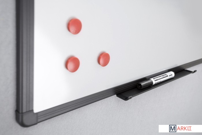Магнитная доска с серебристой полимерной поверхностью для письма сухостираемыми маркерами. Алюминиевая рамка серебристого или черного цвета. Возможно как вертикальное так и горизонтальное размещение доски.