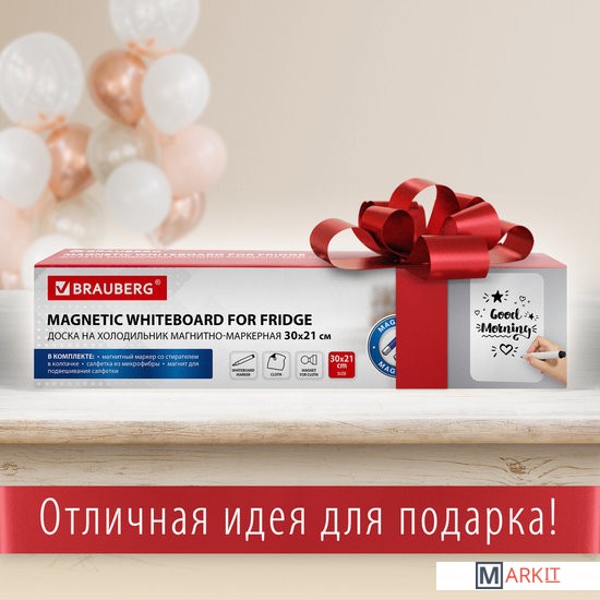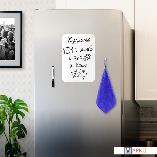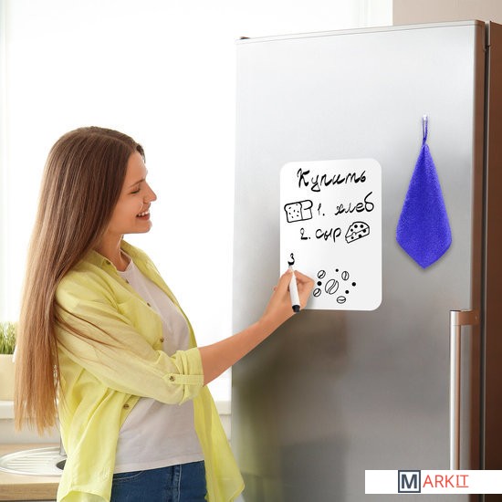 Магнитно-маркерная доска односторонняя на холодильник предназначена для письма маркерами для белых досок и меловыми маркерами. Это гибкая магнитная доска, которая легко крепится к гладким металлическим поверхностям и не требует дополнительной фиксации.Это идеальный инструмент для личного планирования, заметок или переписок со своими домочадцами, рисования или черчения графиков, ведения учёта калорий, продуктов, необходимых для покупки. Доска замечательно подходит для развития творческих способностей. Имеет многоразовую поверхность «пиши-стирай», выполненную из ПВХ.В комплекте: черный маркер для белых досок с магнитом и стирателем в колпачке, салфетка из микрофибры (с «ушком» для подвешивания) и магнит специальной формы, удобной для подвешивания салфетки. Во избежание преждевременного высыхания маркер рекомендуется хранить на холодильнике, колпачком вниз.Поверхность доски не боится воды, но избегайте попадания воды на края во избежание расслаивания.Для очистки доски используйте влажную салфетку.Корректируйте записи при помощи стирателя, встроенного в колпачок маркера.Размер доски 30х21 см (формат А4), так что вы легко найдете для неё место на своем холодильнике среди своих любимых памятных магнитов.Важно! НЕ ИСПОЛЬЗОВАТЬ перманентные маркеры!