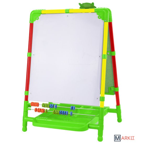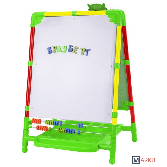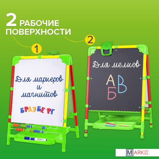 | Комплектация | — пенал для хранения канцелярских принадлежностей, магнитов и мелков;— зажим для крепления бумажных листов или рисунков;— цветные счеты (30 шт.);— магнитный набор для творчества (азбука с русским алфавитом, цифры, символы, магниты);— мелки синего, красног |