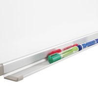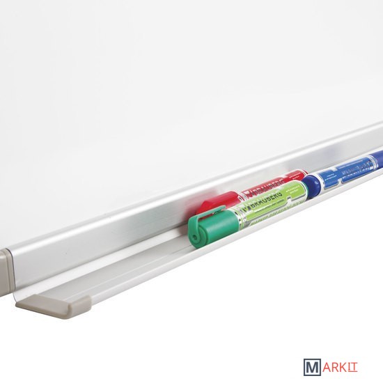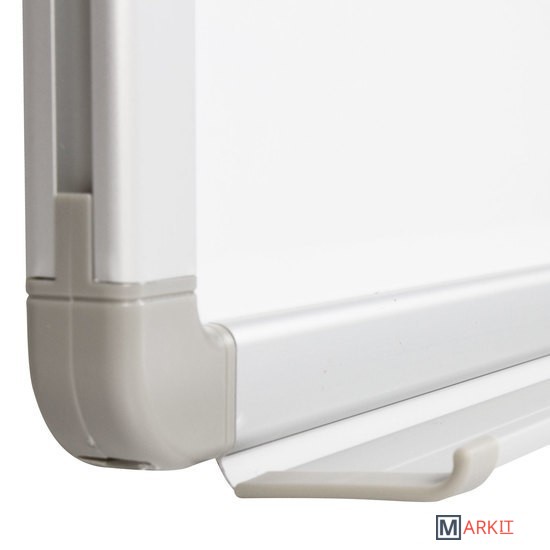 Лаковое покрытие предназначено для письма специальными маркерами для белой доски, а металлическая поверхность позволяет размещать информацию при помощи магнитов. Доска размером 90х120 см имеет укрепленные пластиковые уголки. Профиль придает изделию дополнительную прочность и современный стильный внешний вид. Полочка для аксессуаров и элементы крепления входят в комплект.
