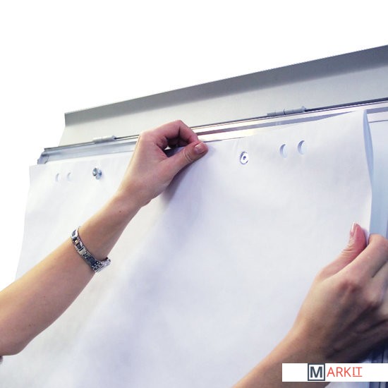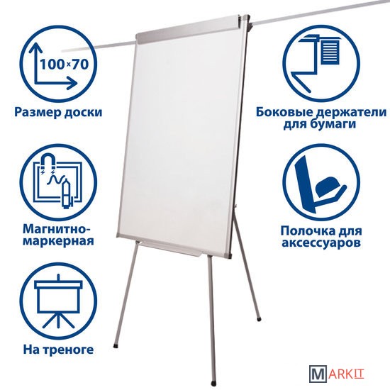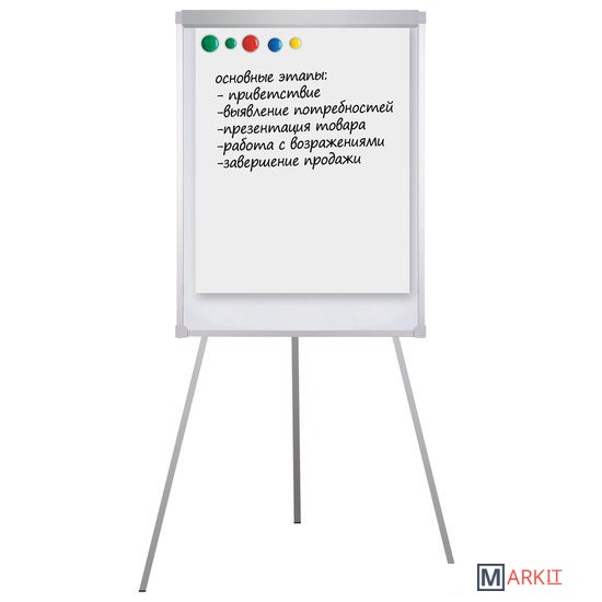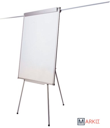 Белое лаковое покрытие предназначено для письма специальными маркерами для белой доски. Размер доски – 100х70 см. Регулируется по высоте до 185 см. Устанавливается на треноге. Металлическая поверхность позволяет размещать объявления при помощи магнитов. Блокнот крепится при помощи неподвижных винтов. Идет в комплекте с лотком для аксессуаров, маркером, стирателем и 4 магнитами. Для защиты рабочей поверхности доски на нее нанесена защитная пленка. Перед началом работы необходимо удалить защитную пленку.