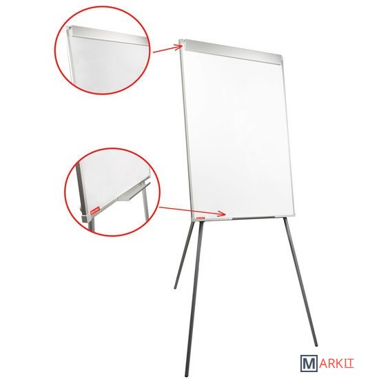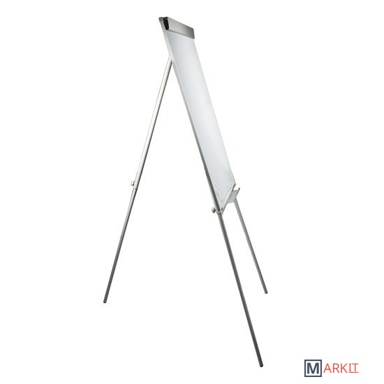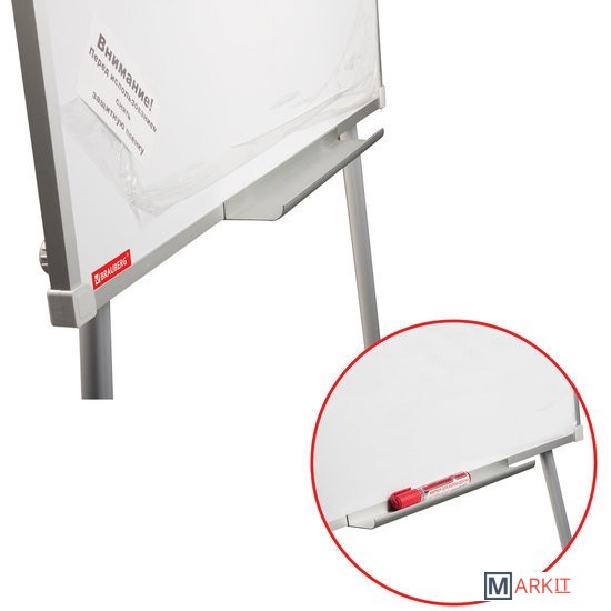 Белое лаковое покрытие предназначено для письма специальными маркерами для белой доски. Размер доски – 100х70 см. Регулируется по высоте до 164 см. Устанавливается на треноге. Металлическая поверхность позволяет размещать объявления при помощи магнитов. Блокнот крепится при помощи неподвижных винтов. Снабжена полочкой для аксессуаров. Для защиты рабочей поверхности доски на нее нанесена защитная пленка. Перед началом работы необходимо удалить защитную пленку.