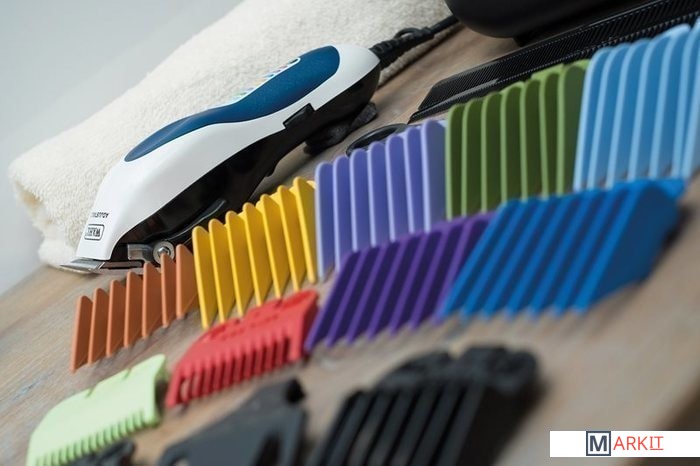 Ширина ножевого блока: 46 мм.9 цветных насадок (1.5, 3, 6, 10, 13, 16, 19, 22, 25 мм).Насадки для стрижки возле левого и правого уха.