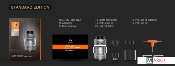 | Комплектация | - Zeus Dual RTA x1- Spare glass tube x1- 510 Drip Tip Adaptor x1- 510 Delrin Tip x1- 810 Drip Tip x1- Allen key x1- Coil (32 ohm) x2- User manual x1 |