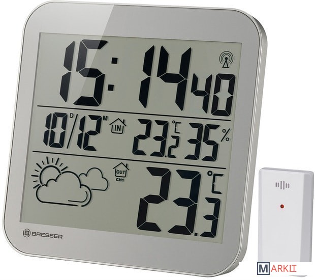 Часы Bresser MyTime LCD – это прибор, который не только показывает время и дату, но и умеет измерять температуру и влажность воздуха в помещении и даже следить за метеоизменениями за окном. Благодаря стильному современному внешнему виду часы смогут украсить интерьер квартиры, загородного дома или офиса. Они станут прекрасным подарком коллеге или близкому человеку.Вся информация выводится на встроенный ЖК-экран. Вверху показывается время, в центре – дата, температура и влажность воздуха в помещении, внизу – температура снаружи помещения и иконка прогноза погоды на ближайшие 12 часов. За измерения внутри помещения отвечает основной модуль, за измерения снаружи – дополнительный термодатчик. Связь между ними осуществляется по радиоканалу.Для питания прибора и внешнего датчика требуются батарейки, которые приобретаются отдельно.