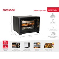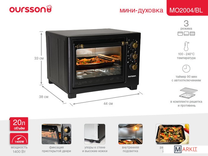Компактная электрическая мини-печь OURSSON MO2004 объемом 20 литров станет отличным решением даже для маленькой кухни. Печь оптимальна по функционалу и комплектации, проста в управлении, занимает мало места. Благодаря регулировке температуры от 100 до 240 градусов и трем режимам работы можно приготовить любое блюдо: от аппетитной курицы до вкусного, рассыпчатого печенья к чаю. Таймер на 90 минут со звуковым сигналом известит о завершении работы, а функция автоотключения не даст подгореть блюду. В комплекте есть решетка и эмалированный противень.