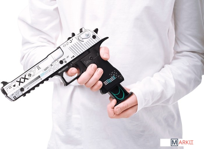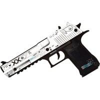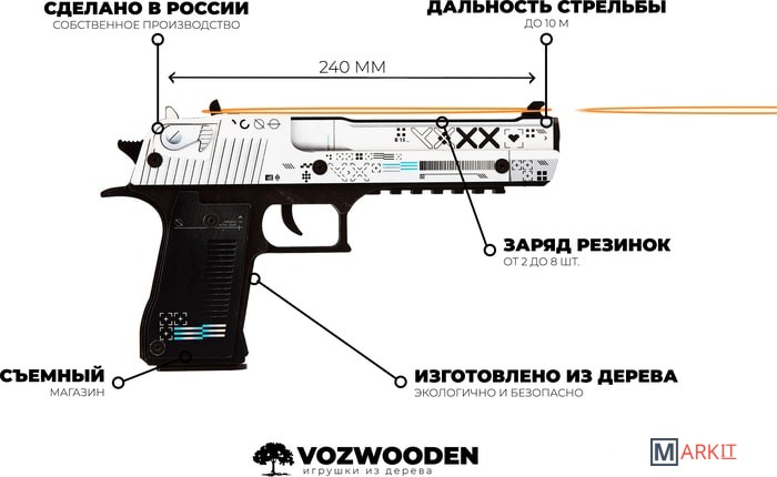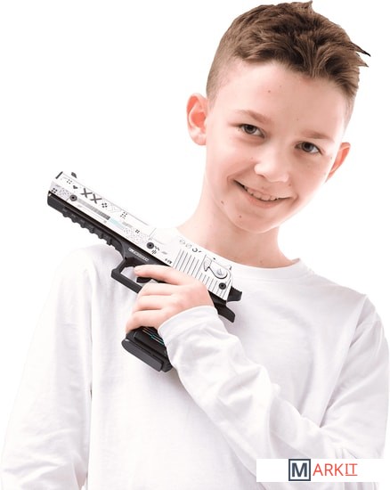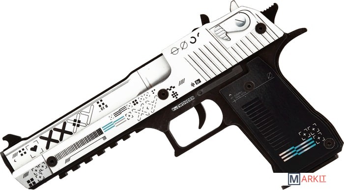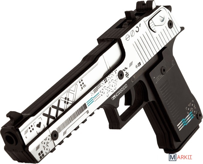 Desert Eagle — один из самых мощных полуавтоматических пистолетов, представленных в игре Counter Strike. Дигл доступен игрокам обеих команд. Отличается высокой точностью на дальних расстояниях, высоким уроном, а также может убить врага с одного выстрела в голову даже в защитном шлеме.Теперь Deagle может купить каждый фанат CS:GO по общедоступной цене. Абсолютно, настоящий пистолет, но без необходимости получать лицензию. Ведь наши деревянные резинкострелы – точная копия своих боевых аналогов. Если вам уже давно хочется выйти из онлайн-пространства в настоящий двор и поиграть с друзьями в «войнушку» — то наши игрушки созданы для вас.Пистолеты стреляют резинками, что абсолютно безопасно для окружающих, но вы почувствуете эффект настоящих выстрелов. Резинкострелы можно заряжать «патронами» единовременно до 8 штук, а остальные хранить в выдвижном магазине.Например, очень популярный скин – Поток информации (Printstream). Равномерно окрашенный в белый цвет затвор пистолета дополнен многочисленными пиктограммами и надписью XXXY. Остальные части пистолета окрашены в сплошной темно-серый цвет. Дизайн украшают перламутровые полосы, что делает его изысканным и утонченным.С деревянным диглом вас ждет увлекательное путешествие в реальный мир, главное, не забывайте сохранять меры безопасности при игре.Размеры игрушки: Длина 24 см, высота 14 см, ширина 2,5 см. В комплекте идет 20 резинок.