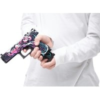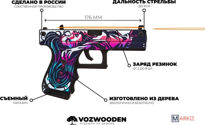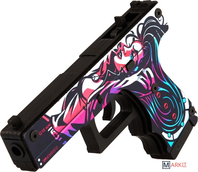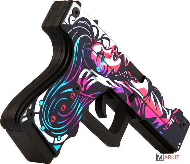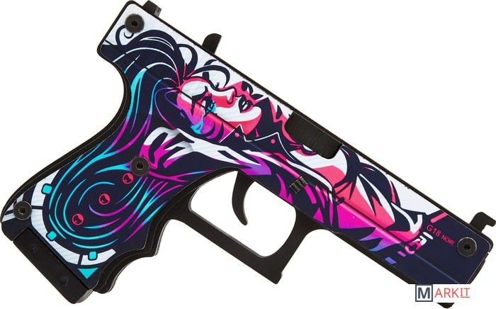 Давайте поиграем? Какое самое первое оружие в Counter Strike получает игрок в команде террористов? Правильно! Угадали. Конечно же, это Glock-18. Этот полуавтоматический пистолет очень удобен,этоGlock-18.Этотполуавтоматическийпистолеточеньудобенвиспользованииихорошосправляетсяснезащищеннымипротивниками.ТеперьдлякаждогофанатасерииCS:GOунасестьпрекрасныйаналогглокаввидедеревянногорезинкострела.Этоабсолютнобезопасныйдлялюдейигрушечныйпистолет,которыйстреляетрезинкаминарасстояниедом10.Сцельюбережногоотношениякмеханизмаморужиярекомендуемзаряжатьегоединовременнонеболее8резинками.Авесьостальнойзапас“патронов”легкопоместитьсяввыдвигающемсямагазине.Новыневолнуйтесь,нашглокизлинииActiveсделанпрактическинеубиваемым.Всемеханизмыдвигаютсязасчетпрочногокрепленияболтами.Крометого,чтодеревянныйGlockполностьюкопируетформунастоящегопистолета,такещеинанихсовершенноточновоспроизведеныскинысерииCS:GO.ПосмотритенаНеоНуар*(Neo-Noir).Высразужеузнаетеэтотскинпоизображениямвстиленеонуарныхкомиксов.Можетбыть,этоотсылкакизвестномукриминальномутриллеру?Эффектносмотритсянакорпусепистолеталежащаятемноволосаядевушка.Черно-белаякартинкадополненадеталямирозового,фиолетовогоиголубогоцветов.НазатворевозледуларасположенанадписьG18NOIR.Размерыигрушки:Длина17.см6,высотасм12,ширина2,см4.Вкомплектеидет20резинок.