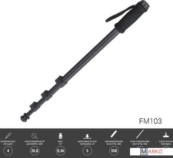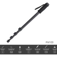 FUJIMI FM103 4-секционный алюминиевый монопод для фото и видео камерМонопод имеет встроенный кистевой ремешок, универсальный разъём 1/4" и чехол для переноскиОсобенности:Лёгкая алюминиевая конструкция (360 грамм)Специальная конструкция нижней части монопода позволяет подстраиваться под тип покрытия (скользкая поверхность или мягкая)Компактный дизайн (550 мм в сложенном состоянии)Удобный чехол с наплечным ремнём для транспортировки в комплектеКистевой ремешок для удобного захватаВысокая максимальная нагрузка до 5 кгУниверсальный разъём для крепления камеры 1/4"