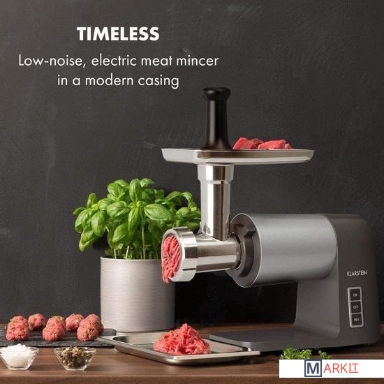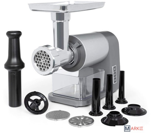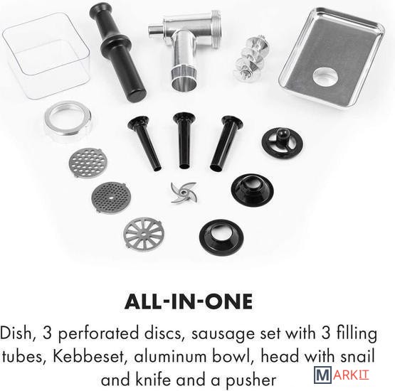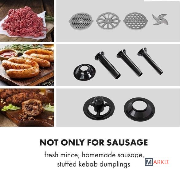 большая емкость для наполнения из алюминиязакругленные края внутри для легкой очисткиреверсивная передача для удаления остатков мяса и тестанабор для начинки колбас с тремя насадками для мясника для мелкой, средней и крупной колбасной массыпластиковый толкательавтоматический выключатель в случае перегрева / перегрузкинескользящие резиновые прокладки для надежного положенияпитание: 220-240 В ~ | 50/60 Гц