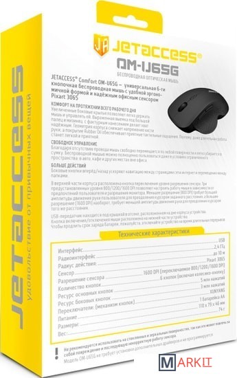 Comfort OM-U65G — универсальная 6-ти кнопочная беспроводная мышь с удобной эргономичной формой и офисным сенсором Pixart 3065.Увеличенные боковые крылья позволяют легко держать мышь и управлять ей. Выраженная выемка под большой палец и мизинец с фактурным нанесением делает хват надёжным. Геометрия корпуса снижает напряжение кисти руки, а покрытие Rubber Oil обеспечивает приятные тактильные ощущения. В верхней части корпуса расположена кнопка переключения уровня разрешения сенсора. Три предустановленных уровня 800/1200/1600 DPI позволяют настроить работу мыши в зависимости от предпочтений пользователя и разрешения монитора. Меньшее разрешение (800 DPI) требует большей амплитуды движения руки пользователя для преодоления курсором заданного расстояния, а большее разрешение (1600 DPI) наоборот, требует меньшей амплитуды движения руки для преодоления курсором того же расстояния.USB-передатчик находится под крышкой в отсеке, расположенном на дне корпуса устройства.Кнопка включения/отключения мыши расположена на нижней части устройства.Чтобы продлить срок заряда батареи, пожалуйста, отключайте устройство на время длительных перерывов.