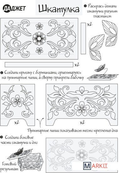 Детский набор трафаретов для 3D-рисования. На каждом трафарете изображен один объект с пояснениями о процессе его создания.Поставляется в конверте. В комплект поставки входят трафареты: колье, броши для кармана, диадема, браслеты и шкатулка.