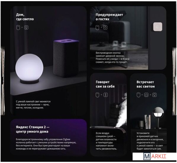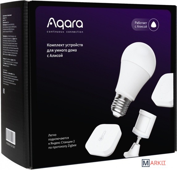 Комплект умных устройств Aqara SYK41 сделает вашу жизнь комфортной. Подключите устройства к голосовому помощнику Алиса и управляйте светом и контролируйте микроклиматом в доме. По сигналу датчика движения и освещения автоматически включится свет в прихожей, а беспроводная кнопка удобно монтируется вместо дверного звонка.Простое подключениеВсе устройства из комплекта Aqara SYK41 поддерживают протокол беспроводного соединения Zigbee и подключаются к Алисе напрямую. Настраивать и устанавливать расписание работы просто через приложение «Дом с Алисой». Выбирайте время, яркость и цветовую температуру лампы, мелодию беспроводной кнопки в интуитивно понятном меню приложения. Умная лампаВ Aqara SYK41 входит LED-лампа ZNLDP12LM мощностью 9 Вт со световым потоком 806 Лм. С ней вам больше не понадобится тянуться к выключателю. Благодаря широкому диапазону рабочих температур от -20 до +40 °C устройство может применяться даже в неотапливаемых помещениях.Датчик температуры и влажностиКонтролировать и поддерживать комфортные климатические условия в доме поможет датчик Aqara. Устройство сообщает температуру и уровень влажности. Работает при температуре воздуха от -20 до +50 °C, может использоваться в отапливаемых и неотапливаемых жилых помещениях.Датчик движения и освещенияКомплект дополнен датчиком RTCGQ11LM. При подключении к умной лампе вам не придется искать выключатель при входе в темную квартиру — свет включится автоматически, как только вы откроете дверь. Может использоваться при температурах от -10 до +45 °C. Поставляется с поворотным креплением и стикером для монтажа.Беспроводная кнопкаАлиса предупредит вас о приходе гостей, если вы повесите кнопку Wireless Mini Switch вместо дверного звонка. Устройство не занимает много места благодаря компактным габаритам. Работает без сбоев при температуре от -5 до +50 °C. Легко крепится к поверхности с помощью клейкого стикера в комплекте.