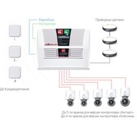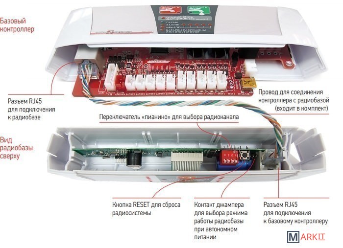 Радиобаза позволяет контроллерам «Аквасторож» работать с беспроводными датчиками. Один из радиодатчиков в наборе с функцией радиокнопки. Радиобаза поддерживает 8 беспроводных датчиков «Аквасторож». Совместима с системами «Классика» и «Эксперт».