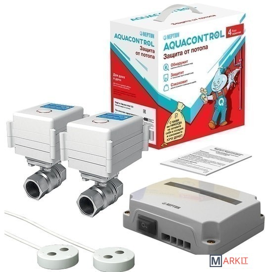 | Комплектация | Модуль управления Neptun Base-1штДатчик контроля протечки воды SW007-2 штКран шаровый с электроприводом серии Neptun Aquacontrol 220В-2шт |