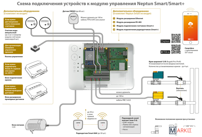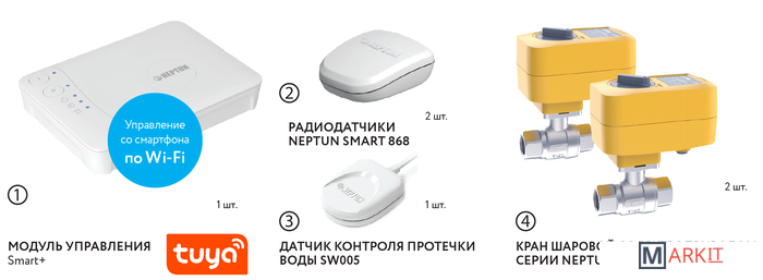 Умная система защиты от протечки воды Neptun PROFI Smart+ предназначена для обнаружения и локализации протечек воды в системах водоснабжения. Компоненты системы связаны и взаимодействуют друг с другом через центральный контроллер (модуль управления Neptun Smart+), который может быть укомплектован дополнительными платами расширения:• RS-485 (для систем диспетчеризации);• Ethernet (для проводного подключения в случае невозможности организации подключения к Wi-Fi).Функции:• Контроль протечки воды• Автоматическая блокировка водоснабжения при срабатывании любого датчика• Звуковая и световая сигнализация об аварии• Запоминание состояния аварии до устранения ее последствий• Защита шарового крана от закисания (Автоматический проворот крана один или два раза в месяц)• Отправка push-уведомлений о состоянии системы на смартфон• Мониторинг приборов учета расхода воды (счетчиков)• Удаленное управление подачей воды при помощи смартфона• Контроль показаний расхода воды с приборов учета ГВС и ХВС