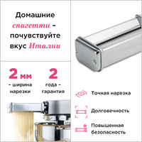 С помощью насадки KAX 984 для приготовления пасты Spaghetti можно приготовить замечательную домашнюю пасту из натуральных ингредиентов для всей вашей семьи. Спагетти – это самые популярные итальянские макаронные изделия, которые имеют диаметр около 2 мм и длину более 150 мм.