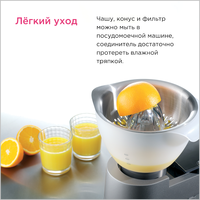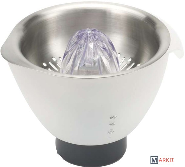 Свежевыжатый апельсиновый сок пробуждает жизненный тонус и прекрасно снимает усталость, к тому же – это просто очень вкусно. Насадка цитрус-пресс Kenwood AT312 поможет вам получать сок из цитрусовых хоть каждый день. Вы можете купить ее для своей кухонной машины серий Chef, Major и Cooking Chef. Приобретение насадки позволяет не покупать отдельный прибор цитрус-пресс, который будет занимать лишнее место. Насадка цитрус-пресс имеет простую конструкцию. Это пластиковая чаша и металлическая решетка. Объем чаши 600 мл, с такой вместительностью вы можете приготовить несколько порций фреша за один раз. Сито изготовлено из нержавеющей стали. Цена насадки - это удобное и лёгкое выдавливание сока до последней капли. Принцип работы прост. Фрукты необходимо предварительно подготовить – разрезать их на половинки, затем открытой частью поместить на рабочую часть насадки. Ребристый конус за счет своего вращения будет выжимать жидкость из фрукта. В сите останутся косточки, и в чашу попадет уже чистый сок.