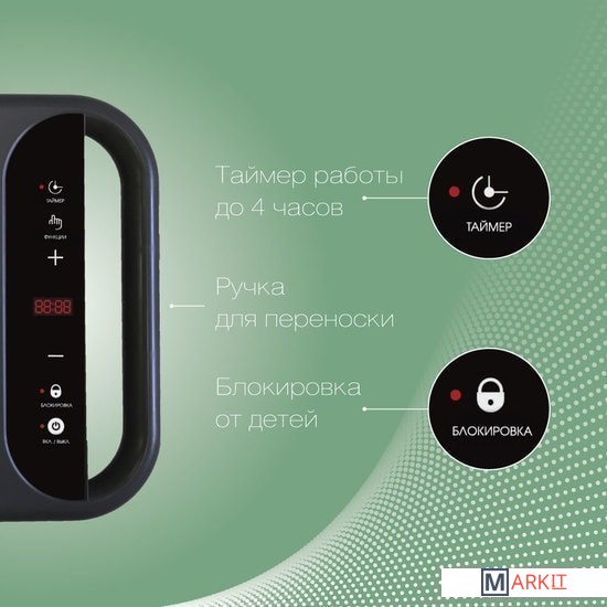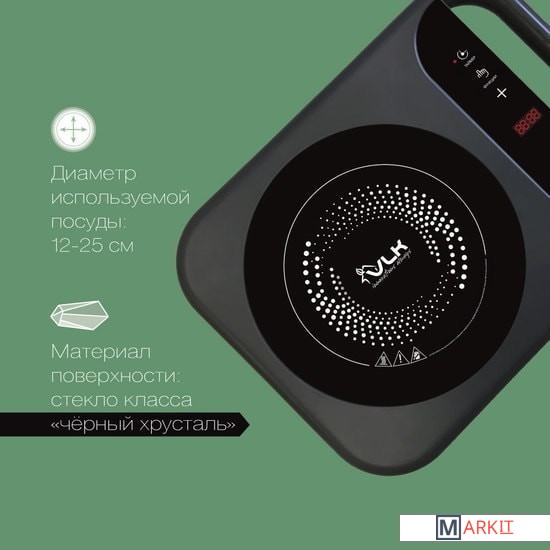 Максимальный вес нагрузки: до 15 кг;Защита от перегрева и скачков напряжения сети;Материал поверхности: стекло класса «черный хрусталь»;Ручка для переноски;Длина шнура: 1.35 м.