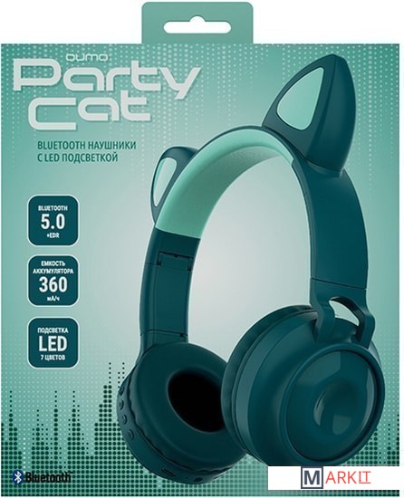 Bluetooth наушники с микрофоном Qumo Party Cat - это беспроводная полноразмерная гарнитура, с оригинальным дизайном с многоцветной подсветкой, разработанным специально для вечеринок. Для передачи сигнала используется современная версия Bluetooth 5.0.Беспроводная гарнитура Qumo Party Cat выполнена из прочного ABS пластика, что делает ее прочной и долговечной. Bluetooth гарнитура Qumo Party Cat имеет встроенный аккумулятор ёмкостью 360 мА-ч. Встроенный FM-приемник и способна автономно работать до 10 часов.