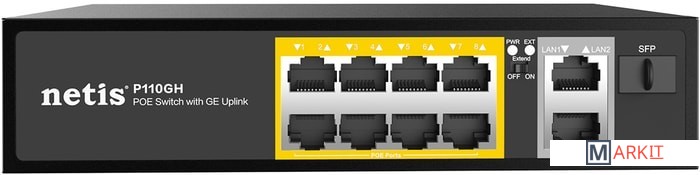 Коммутатор netis P110GH PoE+ является прекрасным решением для создания домашней или офисной сети. Совместимость с PoE камерами, Wi-Fi точками доступа и другим оборудованием, в том числе без поддержки PoE для передачи данных в сети. Все 8 портов RJ45 (со скоростью 10/100 Мбит/с) поддерживают технологию питания по Ethernet (PoE+). Устройство автоматически распознает и подает питание на оборудование, поддерживающее стандарты IEEE 802.3af и IEEE 802.3at: например, PoE точки доступа, IP-телефоны, IP-камеры и т. д. При этом электропитание и данные передаются по одному и тому же кабелю, что позволяет подключить к сети новые устройства, расположенные вдали от линий электропитания или розеток. Помимо прочего, устройство обладает двумя Gigabit Ethernet uplink-портами и SFP оптическим портом.
