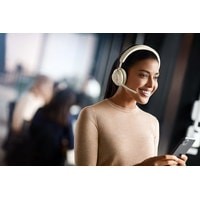 На корпусе находится индикатор Busylight который автоматически загорается во время телефонного разговора или встречи. Вы также можете включить его самостоятельно с помощью кнопки. Поэтому, даже если вы находитесь в эпицентре событий, индикатор Busylight не даст вас побеспокоить.Микрофон гарнитуры можно отключить, переместив штангу микрофона в верхнее положение, и включить, переместив ее в нижнее положение. На входящий вызов можно ответить, переместив штангу микрофона вниз, близко ко рту.Гарнитура может принимать и обрабатывать несколько вызовов одновременно.Наушники поддерживают голосовые указания - оповещения, помогающие настроить наушники или сообщающие о состоянии наушников.