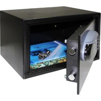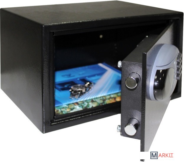 Толщина двери 6 мм., толщина корпуса 2 мм., дверь запирается надежным электронным сейфовым замком S7 (Тайвань) с электродвигателем. Корпус имеет отверстия в нижней, задней стенках для крепежа к полу и стене.