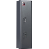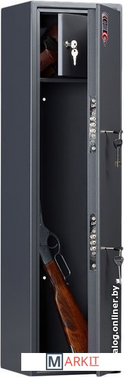 Предназначен для хранения огнестрельного оружия. - толщина металла корпуса и двери – до 2 мм- оборудован патронным отделением, запирающимся на ключ, полками и ложементами для ружей- комплектуется двумя ключевыми замками- максимальная высота ствола 977 мм- конструкция патронного отделения позволяет размещать оружие, задействуя всю высоту сейфа- наличие анкерных отверстий для крепления сейфа к стене
