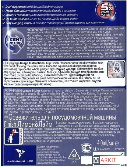 Освежитель FINISH нейтрализует неприятный запах в посудомоечной машине и придает приятный цитрусовый аромат. КАК ИСПОЛЬЗОВАТЬ:Закрепите освежитель на корзине для посуды или повесьте на верхнюю полку, убедившись, что он не блокирует разбрызгиватели воды и отсек дозатора. Замените освежитель, когда исчезнет запах. Освежитель сохраняет аромат примерно на 60 моющих циклов.