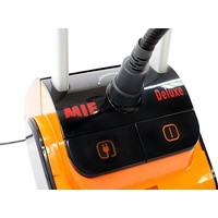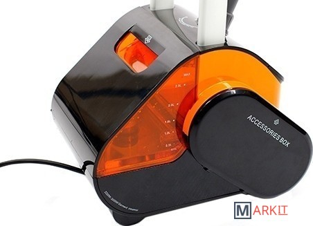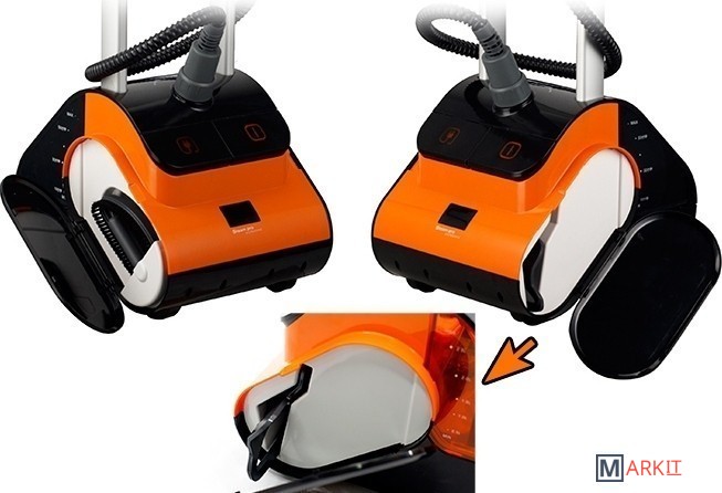 В комплекте приспособление для отпаривания воротника, доска из термостойкого пластика, тефлоновая варежка, зажим для стрелок, вешалка, щетка для бархата, 2 ворсистые щетки, сумка с логотипом.Электронный дисплей и три режима отпаривания. На электронном дисплее отображаются выбранный режим интенсивности отпаривания, суммарное время работы отпаривателя, индикатор готовности пара, индикатор низкого уровня воды, индикатор тревоги, когда вода в баке закончилась.Автоматическая намотка электрошнура. Боковые отсеки для аксессуаров. Футляр для аксессуаров. Электронное управление. Защитное отлючение аппарата.